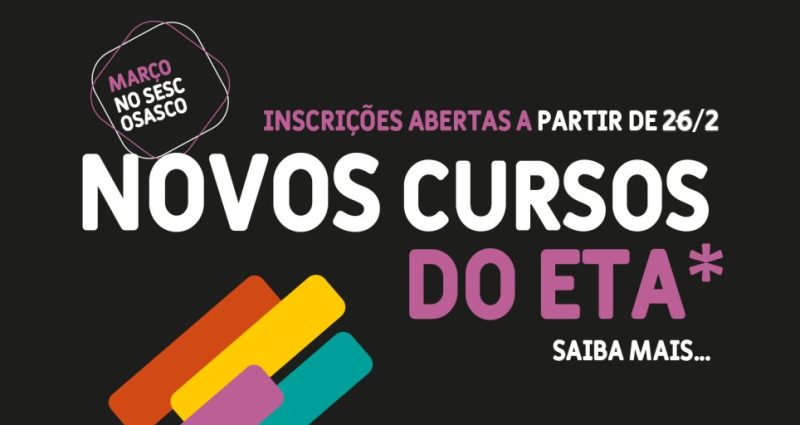Estão abertas as inscrições para os cursos de abril do ETA – Espaço de Tecnologias e Artes, no Sesc Osasco. As inscrições começam no dia 26 de março, quarta-feira, às 14h, e devem ser feitas pela Central de Relacionamento Digital .