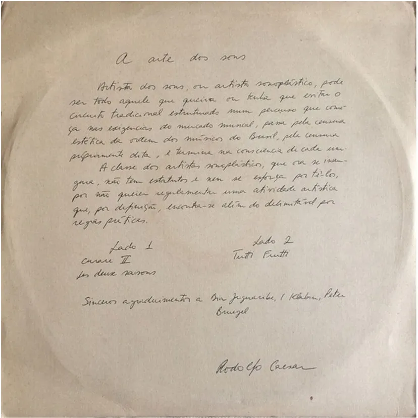 Com o peso de uma iniciação, a música concreta, à qual Caesar é tributário, está no epicentro de sua formação, senão de si. Na contracapa do disco, num documento que amplifica o novo território sonoro ocupado, uma letra miúda manuscrita, de traço leve e inclinada, falsamente sugerindo uma mansuetude incompatível com a evidente inquietação de espírito do compositor, traz a público sua definição do ofício e sua já aguerrida tomada de posição nas antecâmaras da arena futura a que se dirige. Lê-se, com todas as letras: