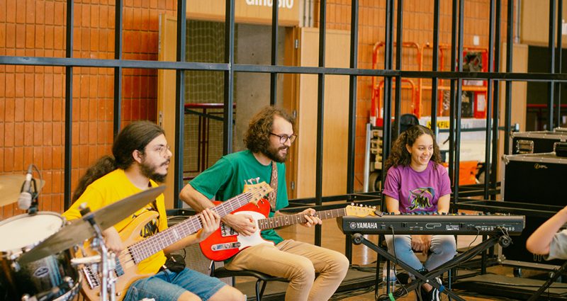 Conducted by the performers of the SalaMUDA Art Collective, who play different instruments live, the audience of this improvisational play is invited to let their bodies move to the beat of genres ranging from hip-hop to contemporary dance. The jam session is primarily guided by a practice that the group calls shadowing: the aim is to mimic the music through their bodies, understanding its duration, rhythmic texture, and sound interpretation. But this is a two-way street: space is opened up for children to also propose movements that dictate the rhythm, experimenting with “playing” the music with their own bodies. This way, dance and sound influence each other in different and unpredictable ways, establishing a space for listening and exchange, in which everyone who is there — adults and children alike — can engage in the play.