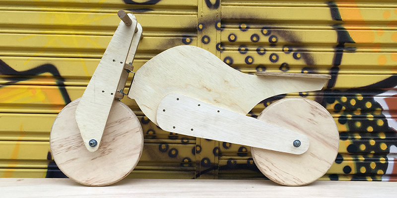 A bike de equilíbrio (Balance Bike) foi construída de forma artesanal em madeira compensada laminada e mecanismos de giro e rolamento com barras roscadas e parafusos infinitos. A produção das peças foi feita com técnicas clássicas de marcenaria. A atividade pôde ser feita também por crianças.
