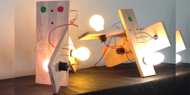 Nessa proposta o aluno fez uma escultura autoportante com 5 planos de madeira de tamanho, cor e forma distinta e em seguida algumas experimentações com uma lâmpada testando luz, sombra, frestas e foco a fim de criar uma luminária escultórica de ambiente… Os pequenos (8 anos +) também foram bem-vindos para construir suas próprias peças.