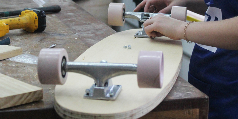 Nessa oficina, o aluno produziu um shape tradicional de skate, isto é, o corpo do skate sem curvatura e com madeira laminada rígida. Todos os processos de fabricação, como projetar, cortar, lixar, tratar e testar, foram abordados para fabricar o corpo do skate.