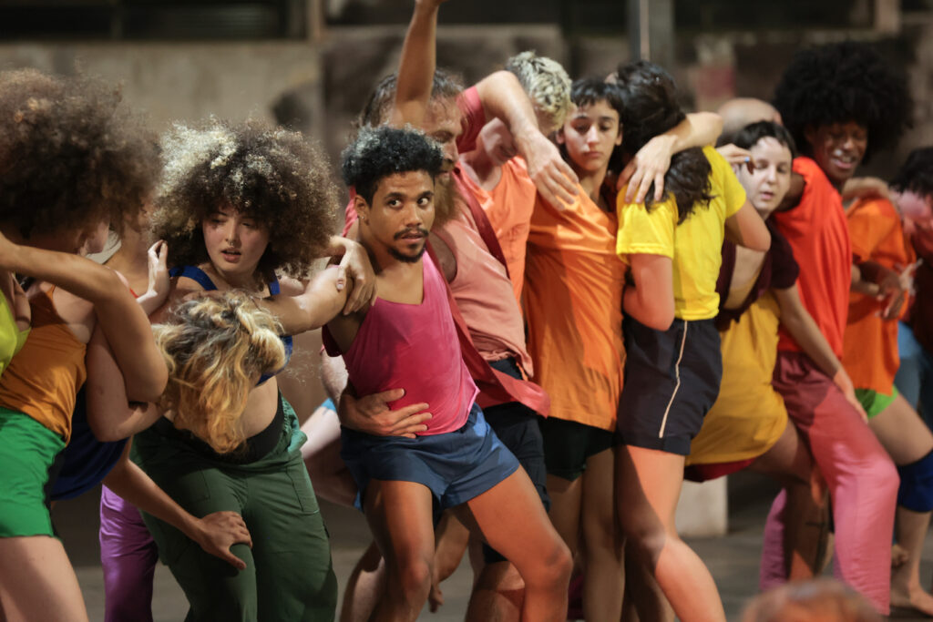 A proposta do trabalho era relativamente simples: montar uma barricada humana, onde as pessoas, entrelaçadas umas às outras, se movimentavam de um lado para o outro em linha reta (ou quase), sem deixar espaços entre si e sem perder o contato com as pessoas mais próximas. O toque físico é incessante, do começo ao fim. As pessoas dão as mãos e os braços e os olhos e as pernas e as costas para subir; e os quadris para segurar e a cabeça para apoiar e o corpo inteiro para esfregar e dançar coletivamente. Quando ensaiamos pela primeira vez, a sensação de compor aquele emaranhado de corpos me remeteu à Guernica, de Picasso. Porém, diferente do quadro, cuja imagem de resistência é feita de ferocidade e desespero, a nossa barricada humana era feita de ferocidade e ternura.