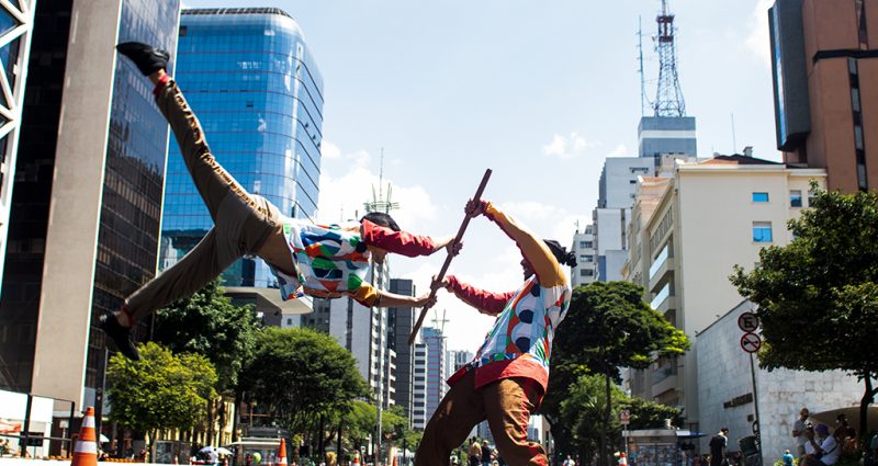 Mané Gostoso is a popular wooden puppet that provides the basis for this show aimed at children by Zumb.boys. This kind of trapeze puppet has articulated legs and arms, operated by strings. The game is about pulling the rods that support it, creating a variety of movements, tricks, and twirls. Inspired by this mechanism, the performers on stage draw on gestures from breakdancing — the basis of the group’s background — and languages such as capoeira. Using wooden sticks, they perform acrobatics, dodging, and improvising numbers, pursuing a virtuous, playful, articulate body. In a dance that engages in a conversation with the audience, this piece opens itself up to encounters and sharing in the present moment. The idea is that it should be an enjoyable, “delightful” moment, reclaiming the simplicity and fun of play.