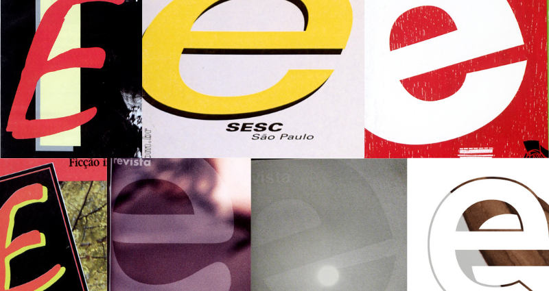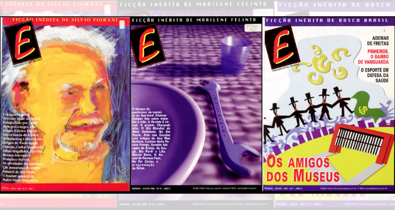 Os primeiros logotipos da revista eram semelhantes, mostrando a letra “E” maiúscula. O primeiro foi aplicado de julho a dezembro de 1994 e o segundo foi utilizado de janeiro de 1995 a julho de 2000 (reprodução/acervo Sesc Memórias)