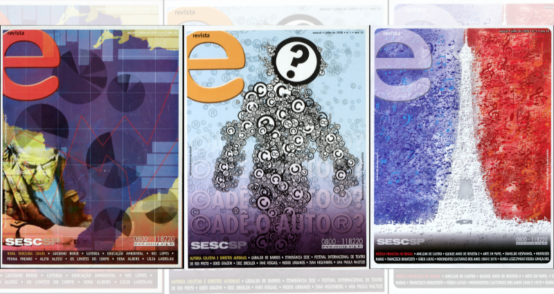 Em 2007, a capa de julho da revista trazia a longevidade como tema. Em 2008, foi a vez de debater direitos autorais e novas formas de autoria coletiva. Em 2009, quando a revista comemorava 15 anos, o ano da França no Brasil trazia à pauta um panorama da presença da música francesa no nosso país. (reprodução/acervo Sesc Memórias)