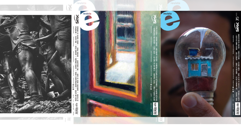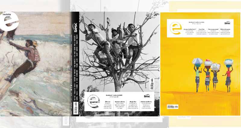 A capa de julho de 2022 trazia a arte “Jangada para o mar”, de Raimundo Cela, e o principal tema abordado foi o brincar. Em julho de 2023, uma foto de Thomas Farkas ilustrava a capa e a pauta principal abordava a educação não-formal. A capa mais recente, de julho de 2024, traz obra do artista Paulo Chavonga, sendo a própria Revista E pauta central, com destaque no editorial e na matéria gráfica. (reprodução/acervo Sesc Memórias)