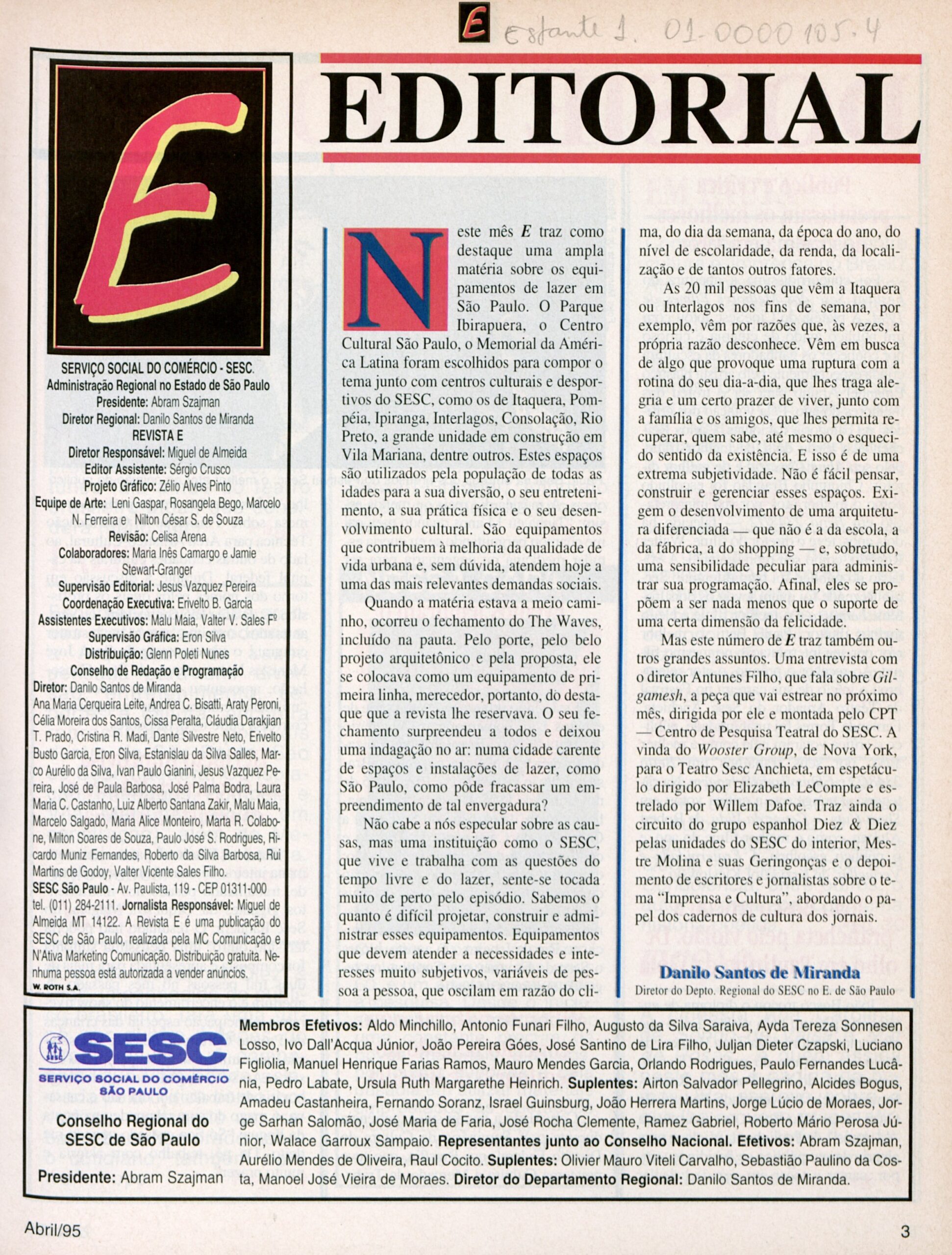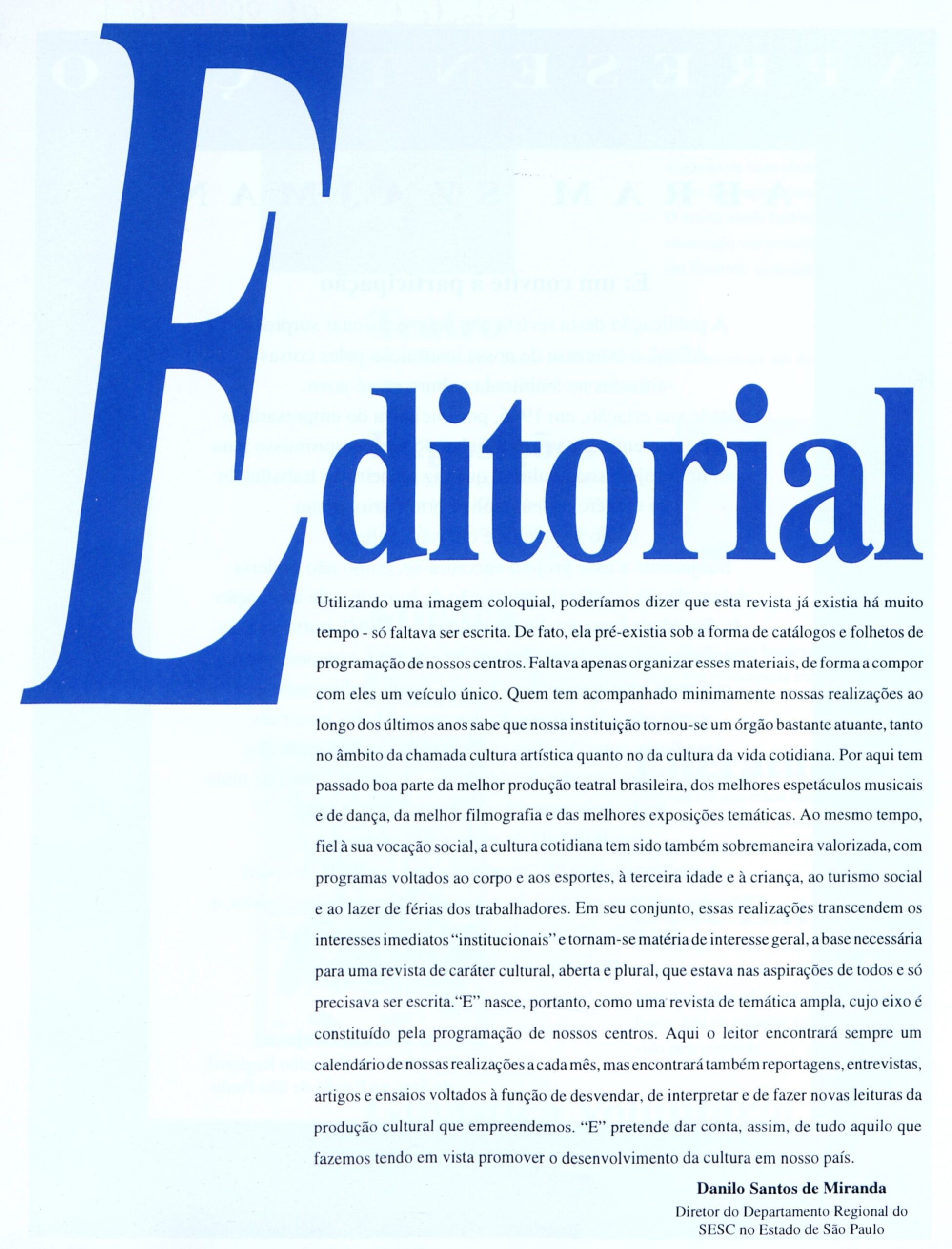 “Utilizando uma imagem coloquial, poderíamos dizer que esta revista já existia há muito tempo – só faltava ser escrita”, diz a abertura do editorial da Revista E número 1, assinado pelo então Diretor Regional, Danilo Santos de Miranda.