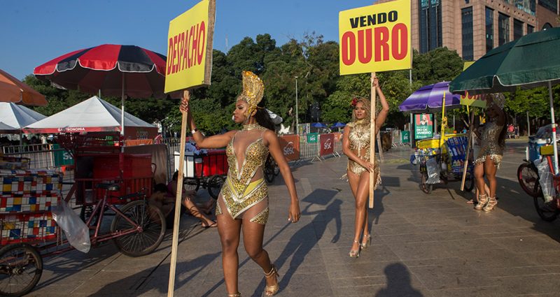 A procession, a parade of living sculptures led by a group of passistas carrying signs and props reminiscent of those used by gold sellers in large Brazilian urban centers. By questioning the multiple meanings of “to see,” “to sell,” “mines,” “memory,” and “monument,” this public intervention seeks to share stories, reclaim memories, and challenge paradigms around Black women in samba. The public route is permeated by samba and by the performance of these dancers. The Biennale features artists from Rio de Janeiro, where the first version was created, and from Campinas, who joined the creative team in residency. Along the way, the performance confronts the stigma imposed on these women (seen as sexual monuments but historically diminished and silenced) and highlights the artists’ agency and creativity, while celebrating the ancestral technologies of Black women.
