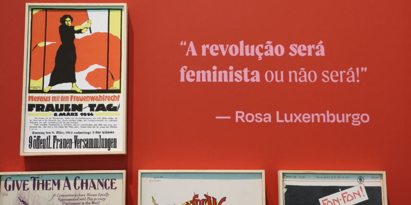 Uma frase que permeia toda a exposição é: “A revolução será feminista, ou não será!”, amarrando narrativas que demonstram a luta contínua das mulheres por uma sociedade mais justa, onde direitos políticos, econômicos e sociais sejam acessíveis a todos. A questão do trabalho doméstico também é abordada com destaque, apontando como no Brasil, muitas mulheres, especialmente aquelas em jornadas duplas, são forçadas a abdicar de estudos e carreiras para se dedicarem exclusivamente às tarefas domésticas.