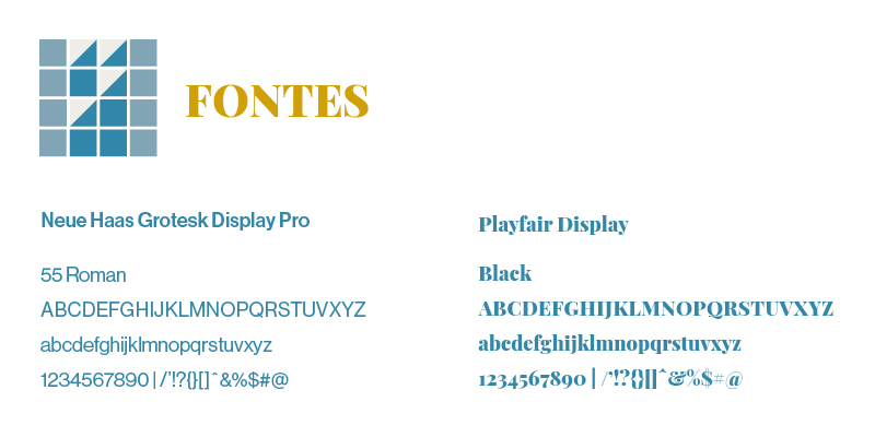 As tipografias escolhidas equilibram o modernismo do prédio com o toque clássico do centro histórico. Foram utilizadas as fontes Neue Haas Grotesk Display Pro, uma tipografia sem serifa que transmite modernidade, combinada com a Playfair Display, uma fonte serifada que evoca sofisticação e tradição. Essa combinação pretende harmonizar o geométrico e o moderno com a elegância clássica, representando de forma simbólica a diversidade histórica e cultural do centro de São Paulo.