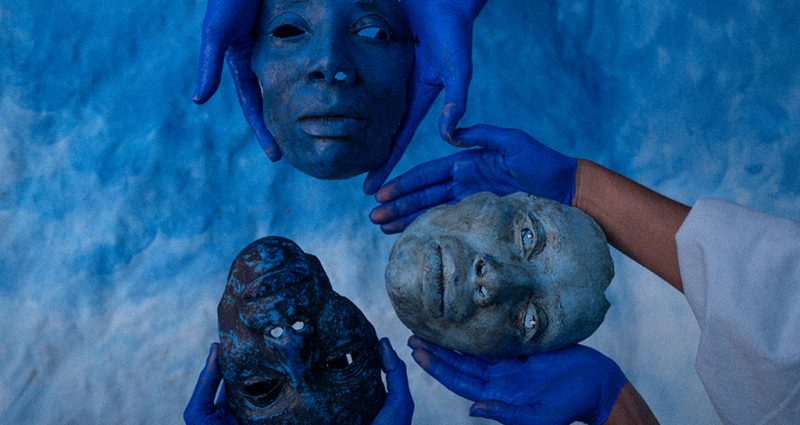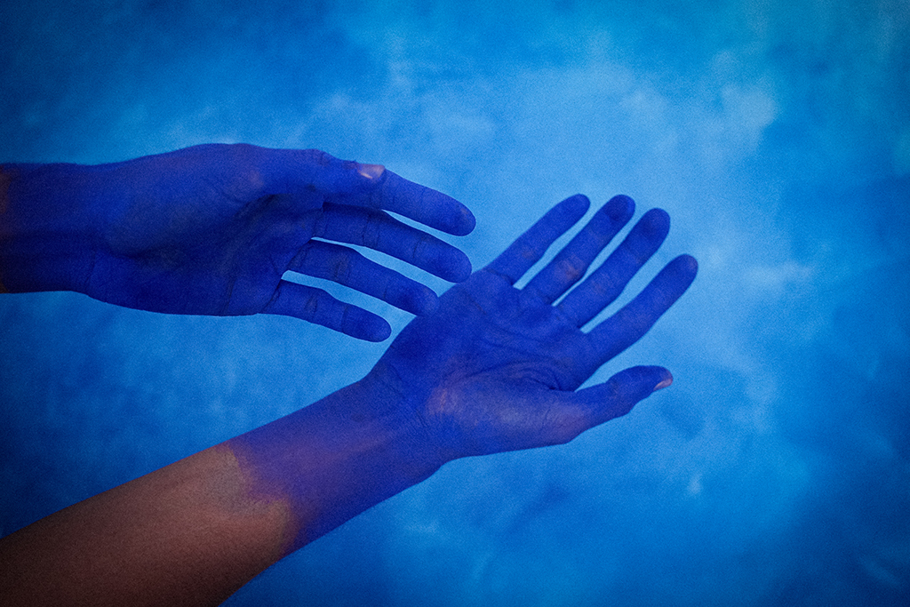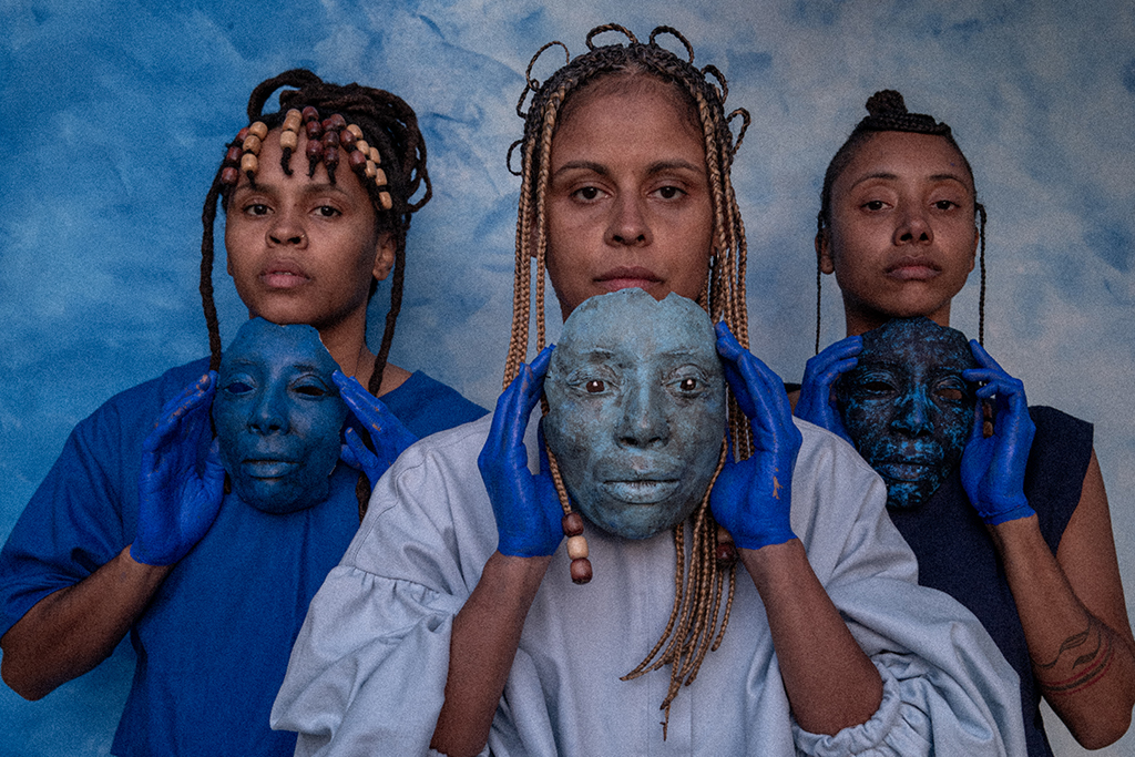 Aprendemos com o universo bantu que existem tantas formas de ver o mundo quantas são as nossas possibilidades de existir. Uma delas está no cosmograma bakongo, que compreende o tempo como uma espiral, não apenas uma linha reta e progressiva. Essa concepção mostra que passado, presente e futuro se interpenetram. Ao invés de entendermos a ancestralidade como algo distante, ela se torna uma presença viva que molda o agora e nos orienta. No espetáculo, essa filosofia se traduz na maneira como a dança, a palavra e a música não são apenas expressões estéticas, mas práticas de evocação. Cada gesto e som são convites para reencantar e tensionar narrativas coloniais. Isso acontece por meio de cartografias espiralares (evocando ciclos de nascimento, morte e renascimento), ritmos e objetos como cabaças, tecidos azuis e máscaras. Reencontramos memórias insurgentes e reafirmamos a potência de existirmos em nossas próprias cosmologias. O mar, kalunga para os bakongo, é uma presença central – um espaço liminar que conecta mundos. Ele surge através da cor azul, que banha a cena como uma metáfora viva, e por ser a linha que separa e costura dimensões: o visível e o invisível, o tempo dos vivos e o tempo dos ancestres. A água, profundamente ligada às espiritualidades negras, se faz presente nos corpos, nos tecidos, nas cabaças, nas vozes e nos instrumentos percussivos, criando uma paisagem sensorial e poética sobre os ciclos da vida.