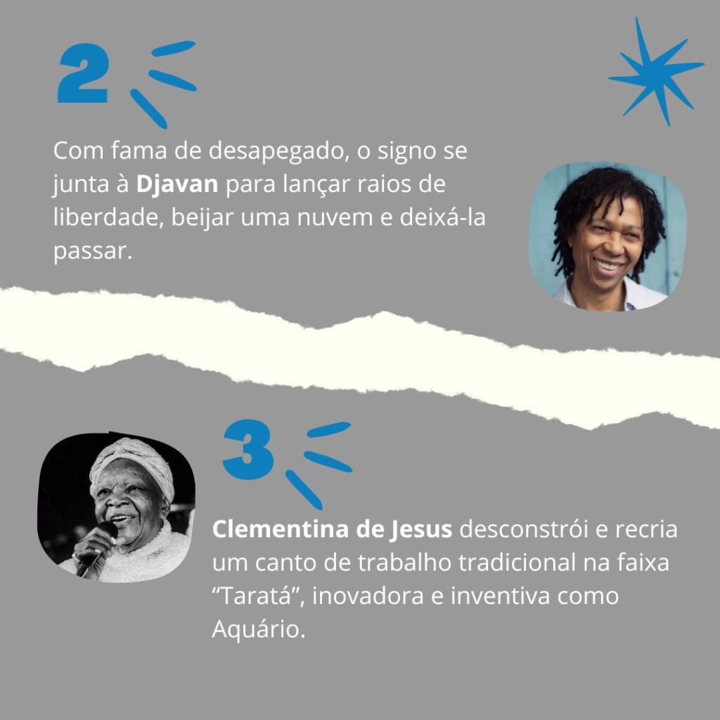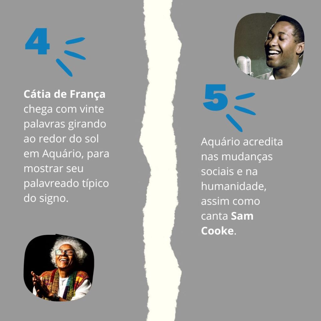 Chegou a hora de mostrar o palavreado, atitude que Cátia de França tem de sobra. Aquário vai às ruas puxando os protestos com seu megafone, e também perambula pela cidade com seu jeito contrário de ser, acompanhado de seu Gato Chamado Cachorro. Às vezes é tido como Marginal ou Loca, chamando naves de outros planetas para pousar; no entanto, o signo é futurista e inovador. Desapegado, lança raios que libertam e, junto a Djavan, beija uma nuvem e a deixa passar. Diferente de Libra, seu parceiro do elemento ar, Aquário se concentra mais nas questões da humanidade do que nas emoções pessoais, e se encontra nos campos das ciências sociais, da educação e da política. Para o signo, o amor é fraterno e tem tantos irmãos que nem consegue contá-los. Com Bob Marley e Chico César na linha de frente, o signo revolucionário mira na justiça social e luta pelos direitos humanos. Idealista, acredita nas mudanças e trabalha por elas, sem perder a fé na humanidade, assim como Carole King e Sam Cooke. Em meio às revoltas, pode perder a mão ao lidar com sutilezas pessoais, mas o próximo signo do Zodíaco promete esse cuidado.