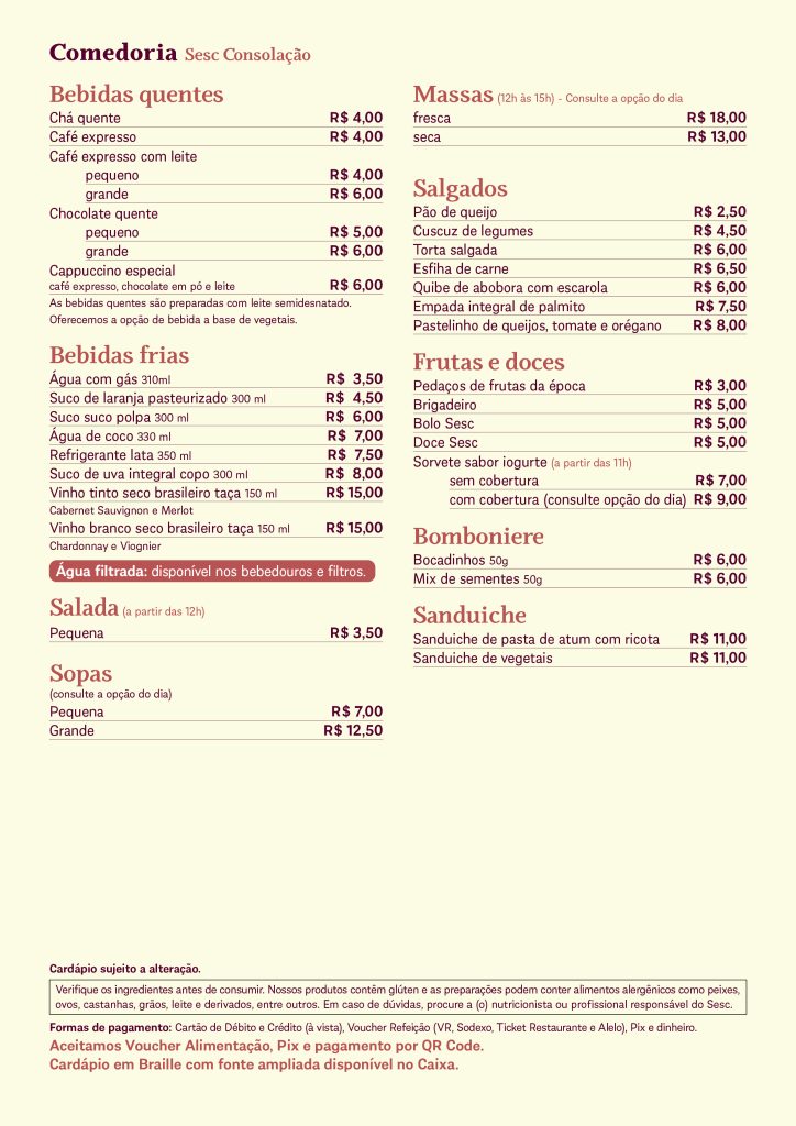 A unidade possui internet WiFi e acessibilidade universal para acesso aos espaços da unidade e utilização de banheiros e vestiários. Na cafeteria você encontra a versão em braille do cardápio. Qualquer dúvida e ajuda os funcionários estão disponíveis para atendê-lo.