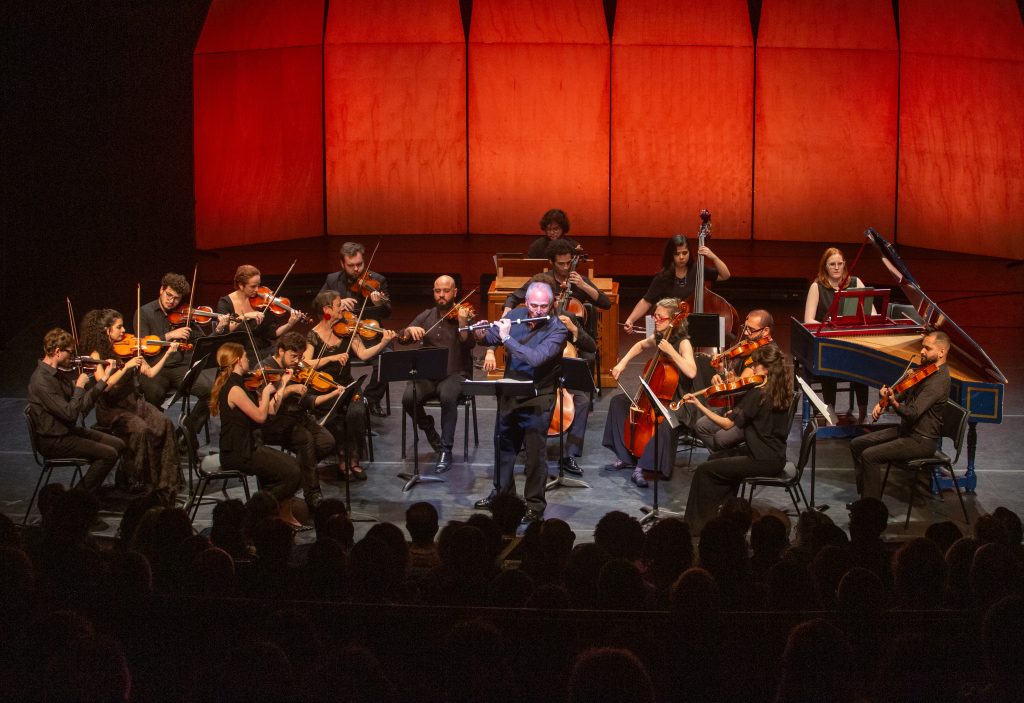 Existem algumas orquestras que se especializam e limitam seu repertório ao período Barroco, do final dos anos 1600 até a primeira metade dos 1700, dedicando-se a compositores como Vivaldi (1678–1741). Chamadas de orquestra de música barroca ou música antiga, são reduzidas, com um número entre doze a catorze músicos, e utilizam instrumentos característicos que levam, por exemplo, cordas feitas de tripas de animais, ou instrumentos que são réplicas de peças antigas e seguem afinações específicas. “Essas orquestras sempre têm no centro a presença do cravo, instrumento indispensável, responsável por fazer o ‘baixo contínuo’ [tipo de acompanhamento tradicional da música barroca]”, diz Baldini.