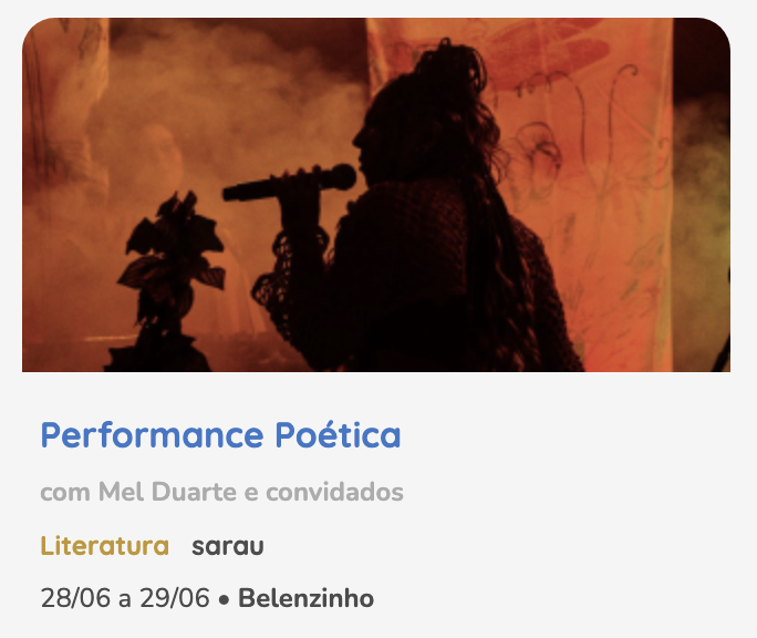 Fechando a programação, tem a potência da Mel Duarte com sua Performance Poética — um verdadeiro manifesto em forma de poesia falada, que transforma palavras em resistência, cura e conexão com temas como racismo, desigualdade e a luta por existir.