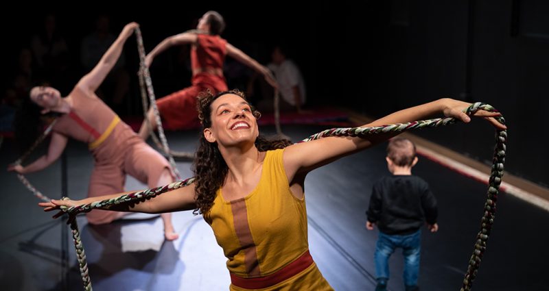 Inspired by childhood and folk cultures, this piece for babies, toddlers, children, and their caregivers celebrates bonds and reawakens emotional memories. An arena-like setting, soft lighting, and a soundtrack featuring folk-inspired melodies create a warm, welcoming atmosphere where the audience is seated around the action. The dancers perform singing, circle, clapping, and lap games, using elastic bands — flexible objects shaped and reshaped throughout the piece. Gradually, the audience — children and adults — is invited to join in, each in their own way, taking part in the dances, games, and musical compositions.