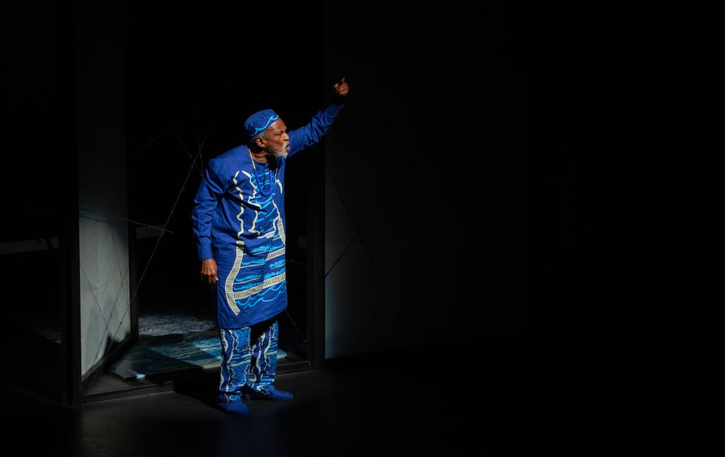 Antônio Pitanga em cena, no espetáculo Embarque imediato, em 2020, no Sesc Consolação, no qual contracena com o filho e ator Rocco Pitanga. Foto: Alexandre Nunis