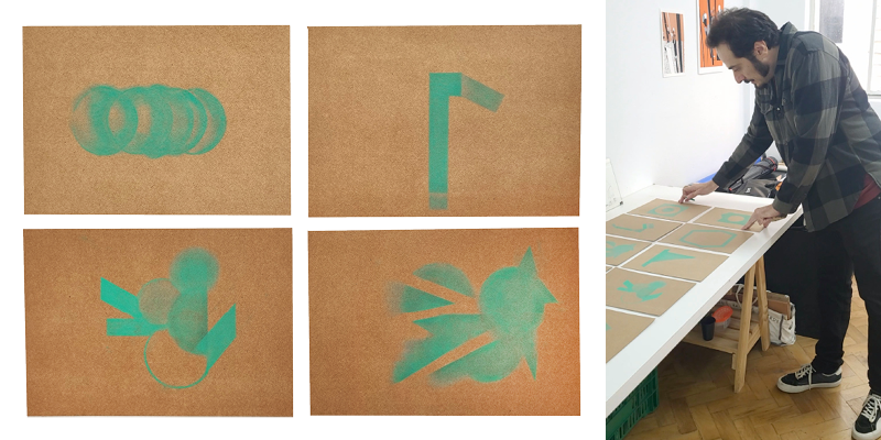 Visca optou por começar com poucos recursos, adotando uma abordagem manual. Com giz pastel seco e papel kraft, empregou cores contrastantes, com destaque para o verde. De acordo com o designer, trabalhar com recursos limitados estimula sua criatividade, especialmente quando precisa buscar uma maneira de expressar um som graficamente.