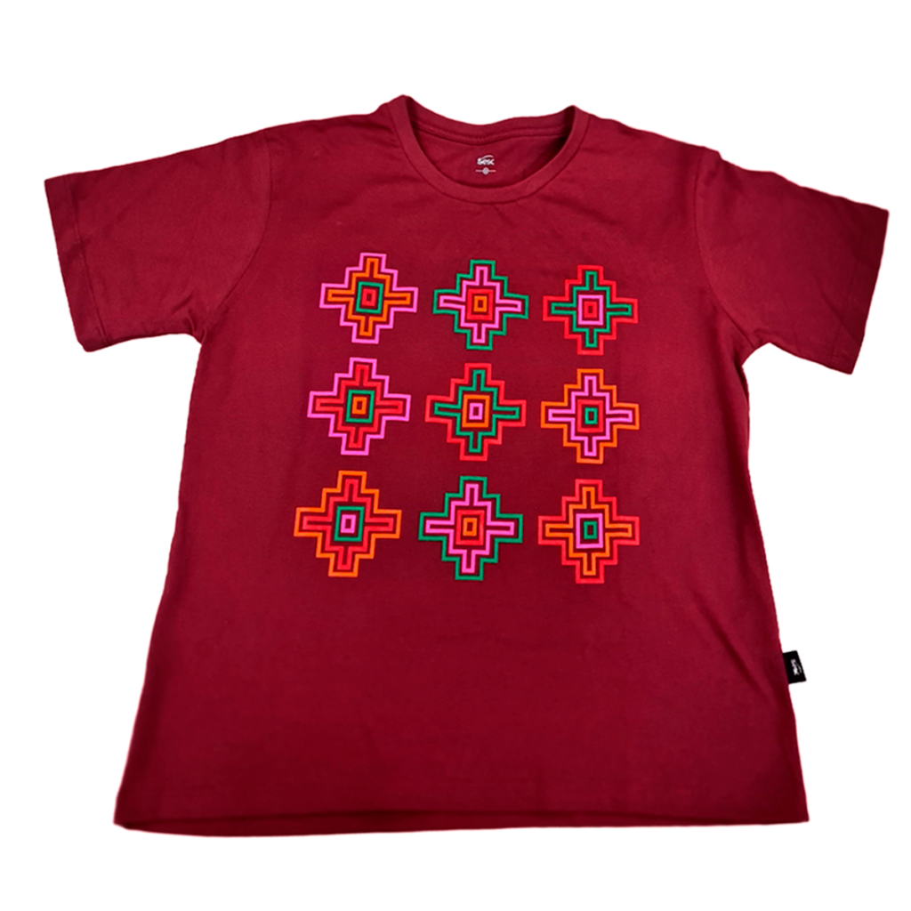 Também conhecida como chakana, a cruz andina possui um formato quadrado e escalonado, com 12 pontas. Acredita-se que sua forma seja uma representação do Cruzeiro do Sul e mostra a importância da observação astronômica para essas sociedades andinas. Em quéchua, chakana significa “ponte” ou a ideia de “atravessar”. Esse símbolo foi utilizado em diversas culturas da região, entre elas Chavín, Wari, Ica e Tiwanaku. A cruz andina aparece na camiseta vinho da linha Mirada.