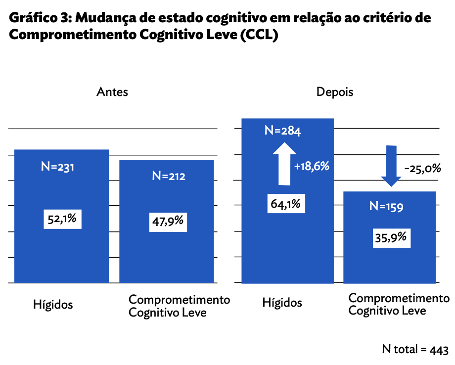 Houve marcante melhoria da pontuação (e percentagem) no escore cognitivo MoCA Teste após a intervenção. Essa melhora foi independente de outros fatores, tais como idade, escolaridade, gênero, comorbidades, fatores de risco, capacidade cognitiva, funcional, velocidade da marcha e sintomas depressivos.