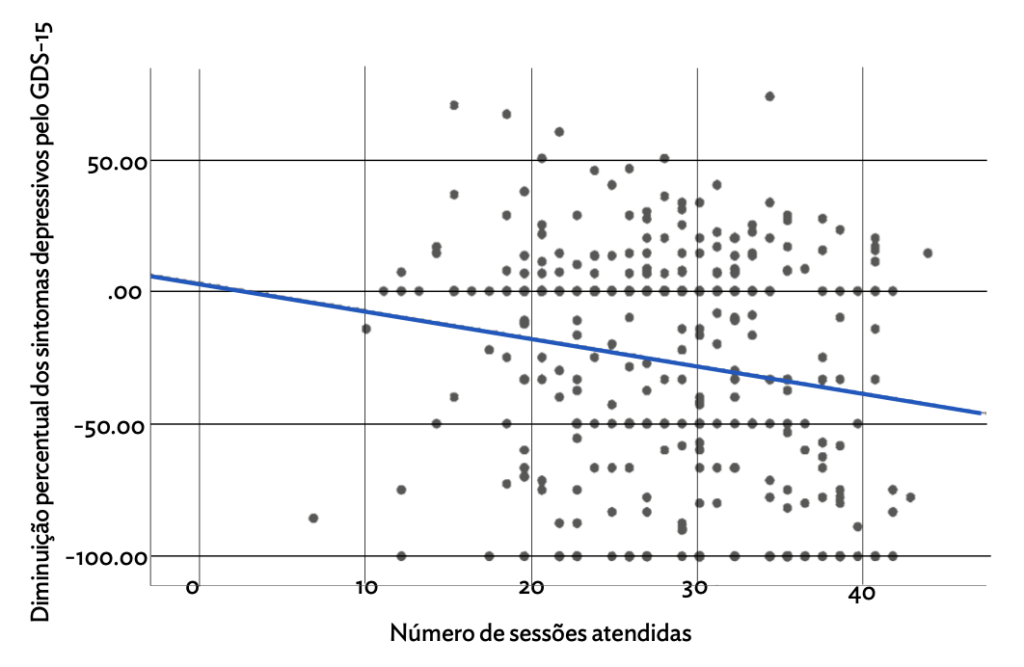 dos sintomas depressivos medidos pelo GDS-15 e o número de sessões realizadas pelos participantes, p=0,020. (32), mostrando a importância da participação assídua no programa