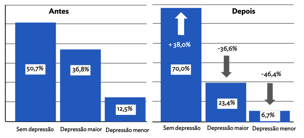 Este gráfico mostra uma importante mudança nos critérios de depressão pela diminuição dos sintomas depressivos antes e depois da participação no programa, e esse efeito ocorreu também entre aqueles que não relataram ter depressão.