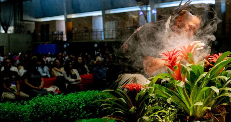 Evocado os bons agouros da ancestralidade, o MC se ocupava em seguida a ritualizar uma reza guarani onde, com cachimbo de bambu e fumo de corda, soprava a fumaça para purificar o ambiente junto as plantas que faziam bordas ao palco e púlpito, plantas essas que junto as falas potentes dos participantes, receberam todas as palmas nos dois dias de seminário.
