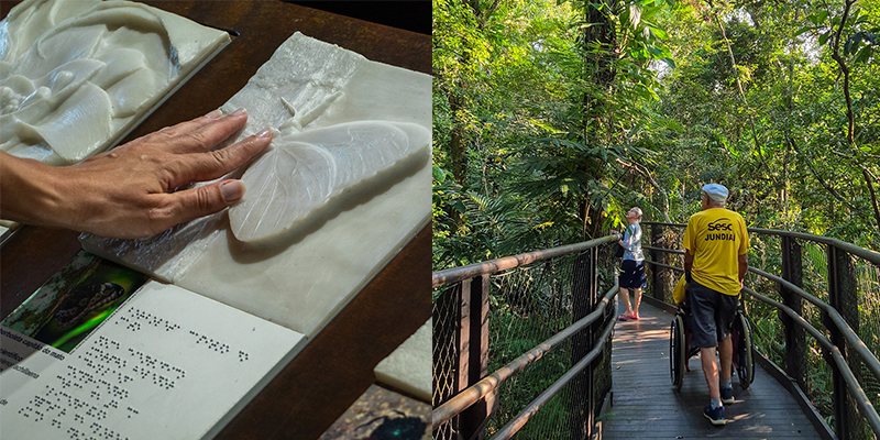 Da esquerda para a direita: Placas em alto relevo com imagens da fauna e da flora. Um idoso e uma pessoa em um cadeira de rodas passeiam pela Trilha do Sentir / Fotos: Duda Menegassi