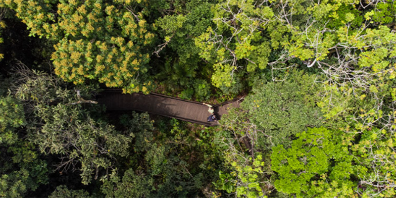 Foto: Imagem aérea da trilha do Sentir na Reserva Natural Sesc Bertioga – Acervo: Sesc Bertioga