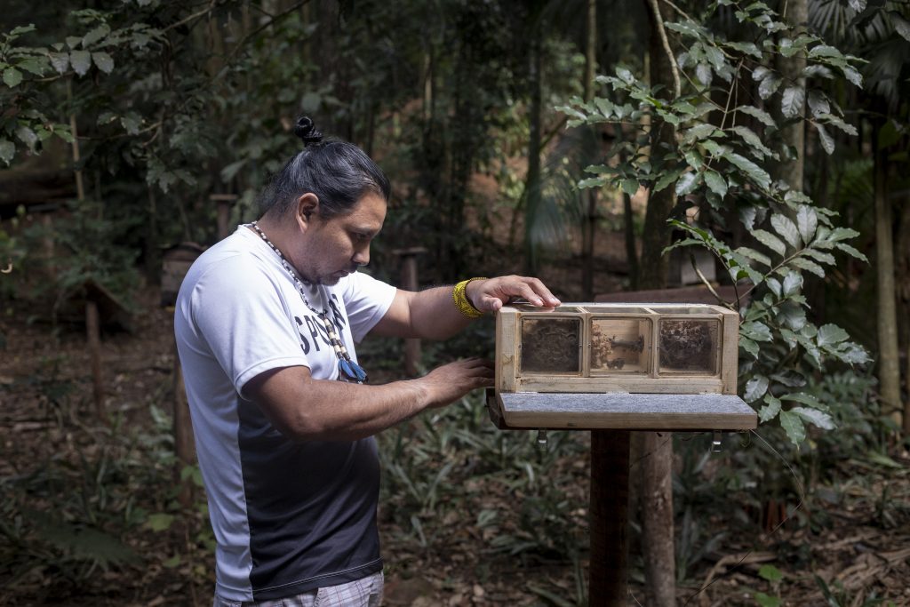Na aldeia Tekoa Yvy Porã, uma das sete da Terra Indígena Jaraguá, na região norte da capital paulista, a atuação da comunidade indígena foi essencial para a restauração da floresta e da sua biodiversidade. Há mais de uma década, seus moradores identificaram a extinção de espécies de abelhas nativas presentes nas histórias contadas por anciões, algumas das quais pelo uso medicinal e relevância em cerimônias culturais. “Em 2014, iniciamos uma busca em outras áreas por espécies extintas e passamos a reintroduzi-las no território. Eram abelhas essenciais para nós, da etnia Guarani, como as uruçus amarelas, as mandaçaias, as borás e as manduris”, conta o cacique Márcio Verá Mirim.