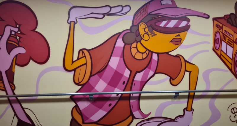 A obra estabelece uma fusão contemporânea entre esporte e cultura urbana, capturando a essência da atitude, dos gestos e ritmos. Por meio de composições fragmentadas e traços marcantes, o mural convida o olhar a uma imersão nas múltiplas camadas do movimento hip hop. A paleta quente e vibrante amplifica a energia. Com Base Dois, grafiteiro e artista urbano