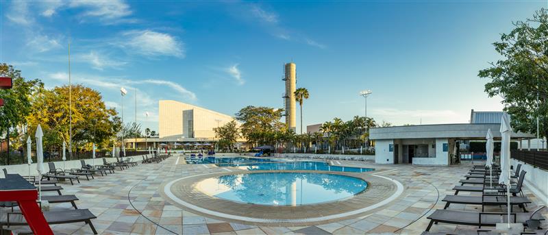 – Piscina com barras auxiliares na borda e rampa de acesso para pessoas com mobilidade reduzida;