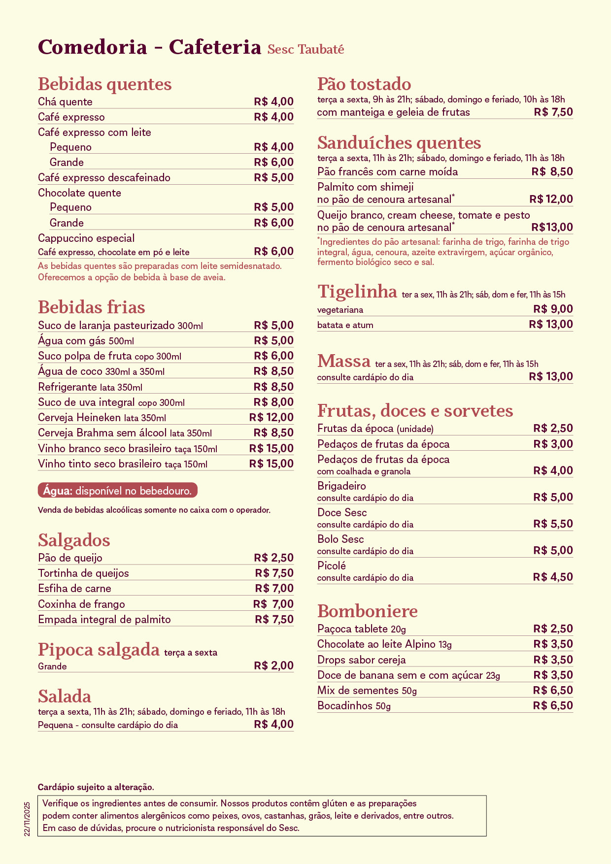 - Cardápio em braile com alto contraste e fonte ampliada disponível no caixa da Comedoria;