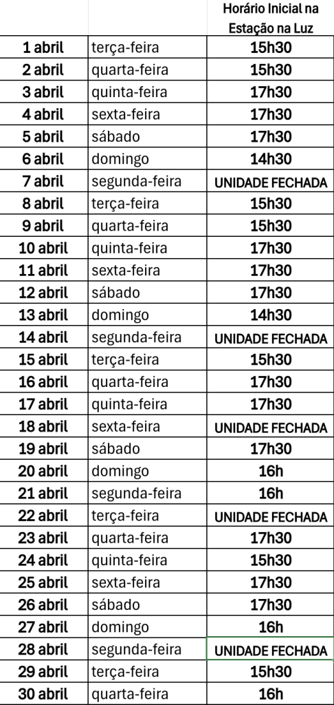 ATENÇÃO: Em caso de via interditada, o ponto de encontro é na saída da Estação da Luz, à esquerda, esquina com a Rua José Paulino, na frente do totem BEM-VINDO AO BOM RETIRO.