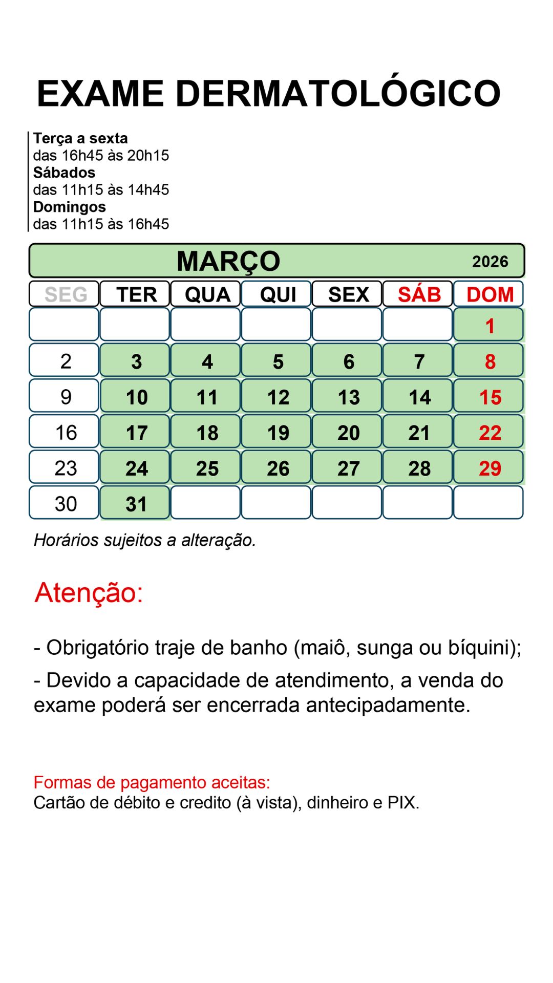 Não é necessário realizar o agendamento para exame dermatológico.