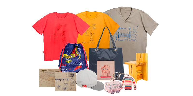 Estudos, aquarelas, plantas e esboços de Lina Bo Bardi inspiraram a linha de produtos para a série Sesc em Obras, criada em 2012. Em cada produto é possível identificar os elementos que remetem à concepção do Sesc Pompeia, desde plantas arquitetônicas até estudos em nanquim da cadeira especialmente elaborada para a Unidade.