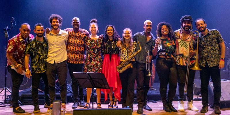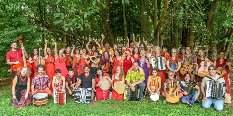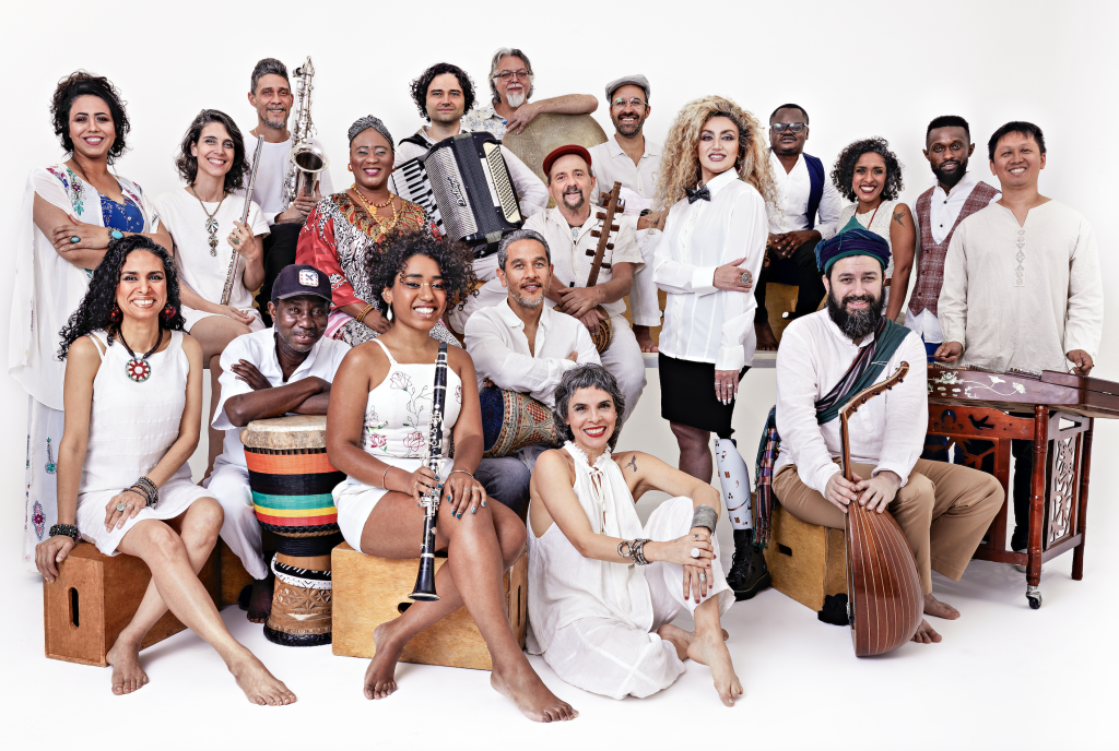 Grupo formado por vinte e dois músicos imigrantes, refugiados de dez nacionalidades e brasileiros, sob a direção musical de Carlinhos Antunes.