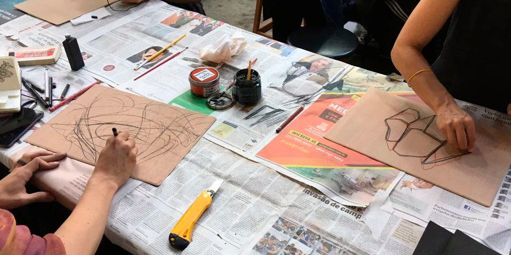 Com Helena Freddi, professora, artista visual e gravurista e Bruna Kim, gravurista, designer e marceneira