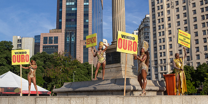 Na primeira, a coreógrafa, cineasta e artista multidisciplinar carioca Carmen Luz apresenta um cortejo urbano, que mescla samba, memória e intervenção artística para ressignificar a imagem da mulher negra sambista. Inspirada em símbolos do comércio de ouro nas grandes cidades, a obra reúne artistas do Rio de Janeiro e de Campinas em um percurso público. Nesse embate entre corpo, cidade e história, questiona estigmas e revela as potências criativas e ancestrais dessas mulheres.