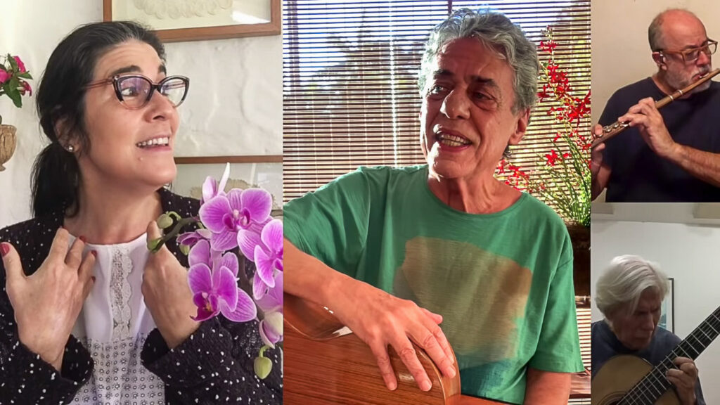 Pelo projeto musical de lives Ô de Casas, durante a pandemia, Mônica Salmaso recebeu o cantor Chico Buarque para interpretarem juntos a canção “João e Maria”, acompanhados pelos músicos Teco Cardoso (flauta) e Luiz Claudio Ramos (guitarra). Foto: Reprodução