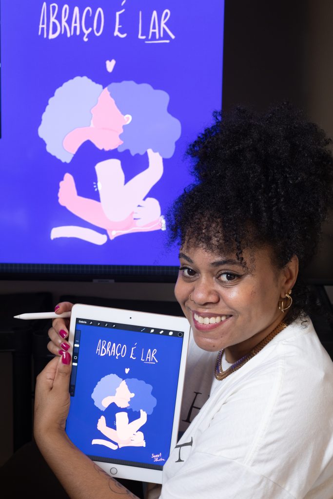 A arte também surge como uma poderosa ferramenta de letramento. A ilustradora e comunicadora Nathalia de Souza, que vive com diabetes tipo 1 e deficiência auditiva, utiliza seus traços para dar visibilidade a corpos e situações reais. Um exemplo prático dessa postura foi sua contribuição visual para o e-book Criança de férias – guia para manter a alimentação equilibrada e incentivar a atividade física, uma publicação da Associação Brasileira para o Estudo da Obesidade e Síndrome Metabólica (Abeso) também disponível em audiobook. Fugindo dos bancos de imagens com modelos que pouco conversam com a realidade da população brasileira, a artista ilustrou diferentes biotipos, etnias e constituições familiares. Em sua página Sweet ilustra, ela expande esse trabalho naturalizando o uso de bombas de insulina e aparelhos auditivos em situações de lazer, de trabalho e do cotidiano. “O fantástico, às vezes, está no simples. Se sentir representado também é saúde”, resume Nathalia.