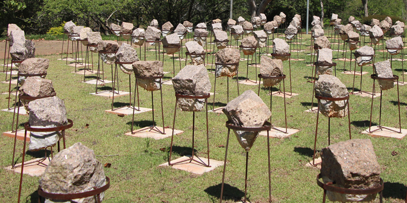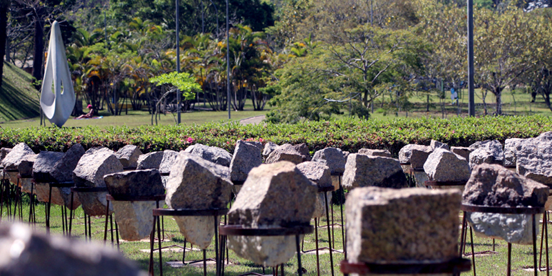 A instalação ocupa um grande espaço, dialogando com o Jardim das Esculturas e com as demais obras, sendo composta pelo ambiente externo, e traz à tona a presença indígena na cultura brasileira, tão presente e ao mesmo tempo tão apagada do cotidiano ao longo da História. As pedras são uma possibilidade de reflexão sobre a relação entre arte e natureza, ser humano e ambiente, e sobre as nossas mais diversas origens.