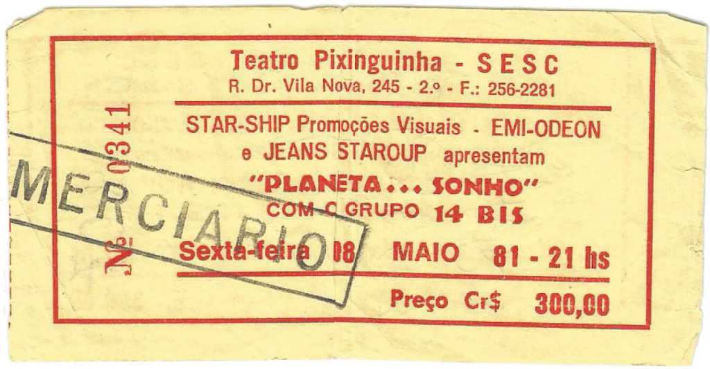 No dia 08 de maio de 1981 fiz minha primeira visita oficial ao teatro. Show “Planeta… Sonho”, com o grupo 14 Bis. Parte das apresentações que promoviam o lançamento do terceiro álbum da banda dos irmãos Venturini, Espelho das Águas. Queria muito ver os mineiros em ação. Sabia que para lá dos arranjos mais pop-açucarados da nova bolacha, o rock ia rolar ali na dimensão ao vivo. Queria ver o Cláudio jogar a cabeleira para trás e detonar a guitarra, queria estar próximo da conexão Criaturas da Noite (canção e álbum do Terço) com o Flávio e o Magrão. Nesses tempos de poucos/primeiros shows no CV, vi tudo isso e muito mais. Aproveitei cada segundo (isso virou regra) como se fosse meu primeiro e último show. Nem daquelas nuvenzinhas frágeis de papel que adornavam o palco me esqueci.