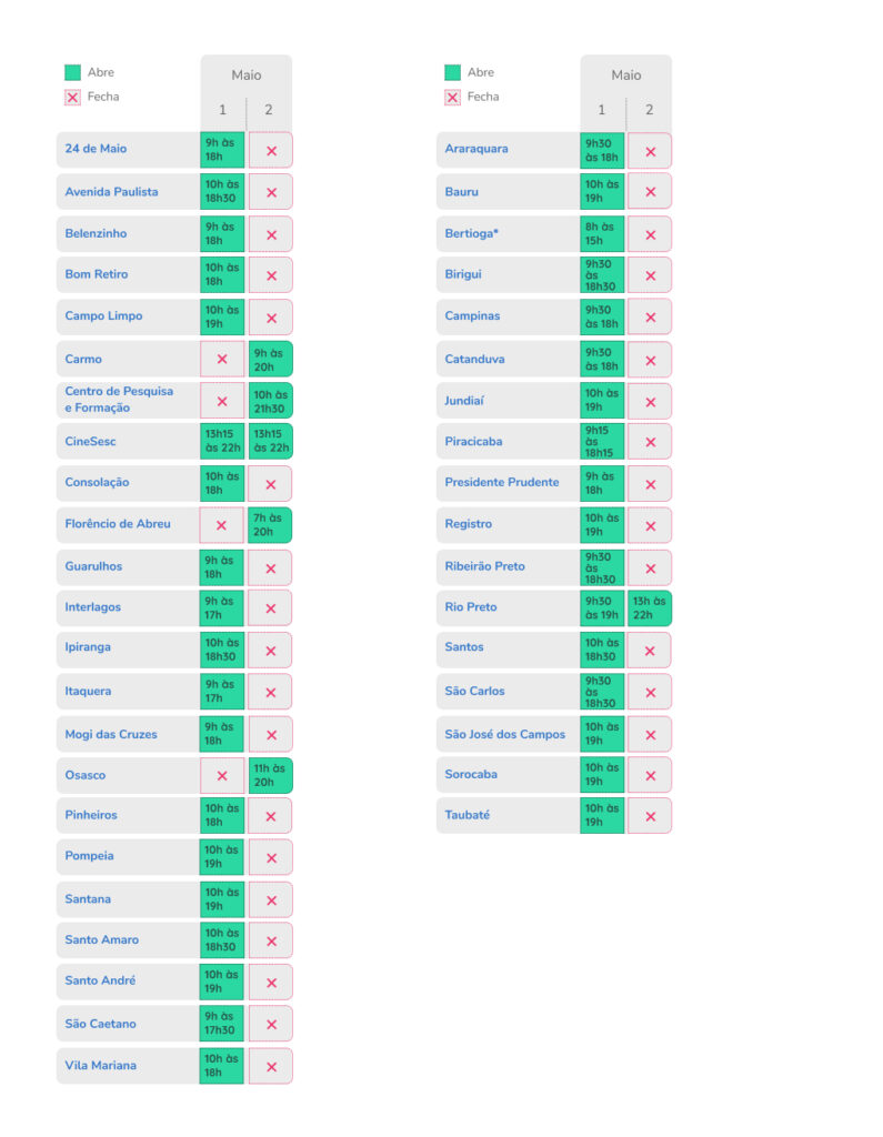 As unidades do Sesc São Paulo funcionam em horário especial neste 1° de maio, feriado do Dia do Trabalho. Confira a seguir: