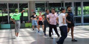 Aula de Ginástica Aeróbica historiada. A temática é sobre os personagens de vídeo games e situações que ocorrem nas histórias dos jogos.