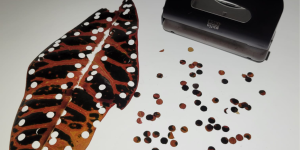 Criação de confetes a partir de folhas secas utilizando furadores diversos.