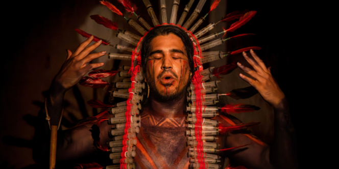 A partir da ideia de Xawara, que significa “fumaça da epidemia da morte” na cosmologia dos yanomamis, Juão Nyn propõe uma travessia contracolonial em que ensaia um reencontro de povos originários com o homem branco. O performer apresenta um manifesto contra as enfermidades trazidas por essa aproximação, desde o contato com novas doenças até a exploração de territórios e comunidades. Para tanto, munido de um cocar de seringas, cria um jogo no qual encena uma prática inversa de escambo, discutindo a lógica do processo de colonização.