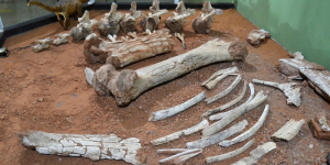 Fósseis de dinossauros com papel reutilizado