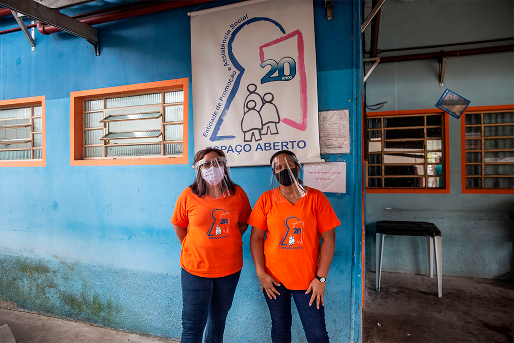 No outro canto da cidade, Cyro Garone Morelli, coordenador da equipe do OdontoSesc na unidade, conversa com Léia Soares, coordenadora de um Centro de Acolhida Especial para Idosos (CAEI). Localizada no Jardim Umuarama, também na zona sul, a instituição é atendida pela equipe do programa Mesa Brasil no Sesc Interlagos e recebe doações de alimentos para compor o prato dos idosos que atende. Funcionando desde 2010 em parceria com a ONG Espaço Aberto, este CAEI é o lar de 62 homens e mulheres na terceira idade em situação de vulnerabilidade social. Sem contato com a família ou vínculo social estável, as pessoas têm no espaço os seus dormitórios, banheiros, sala de TV, biblioteca, lavanderia, cozinha e jardim para tomar sol. Dormem, fazem suas refeições, recebem atendimento à saúde física e mental – de fato, vivem ali. Acostumada a conversar com a equipe do Mesa Brasil, desta vez Léia recebe uma oferta diferente de Cyro – em meio à pandemia, equipamentos de proteção individual se tornam também uma necessidade, para além dos sempre essenciais alimentos. Por isso, o Sesc oferece 50 protetores faciais de acetato, que podem servir como um acréscimo à proteção das equipes de educadores e enfermeiros do Centro.
